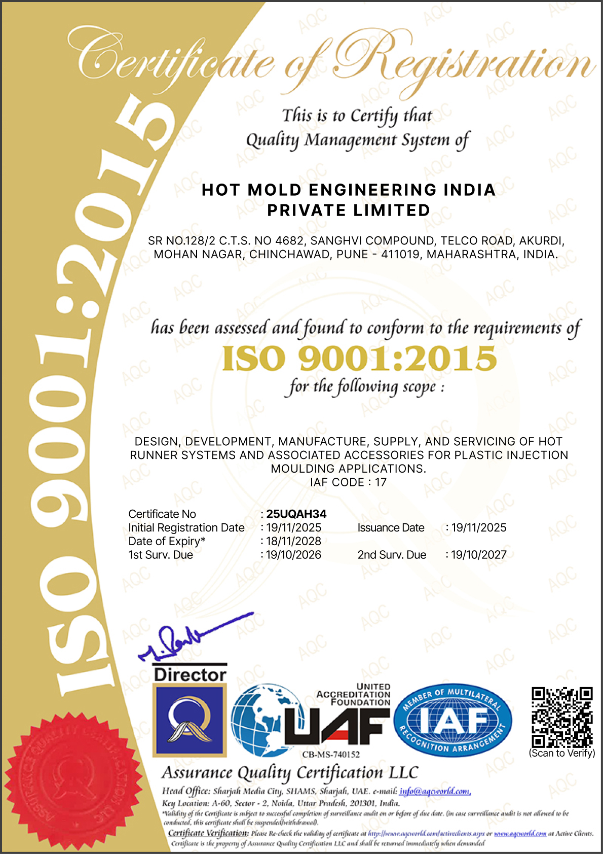 Our scope of certification includes the design, development, manufacturing, supply, and service of hot runner systems and related accessories for plastic injection moulding applications. It reinforces our commitment to delivering reliable, high-precision solutions that meet industry expectations at every stage of production.